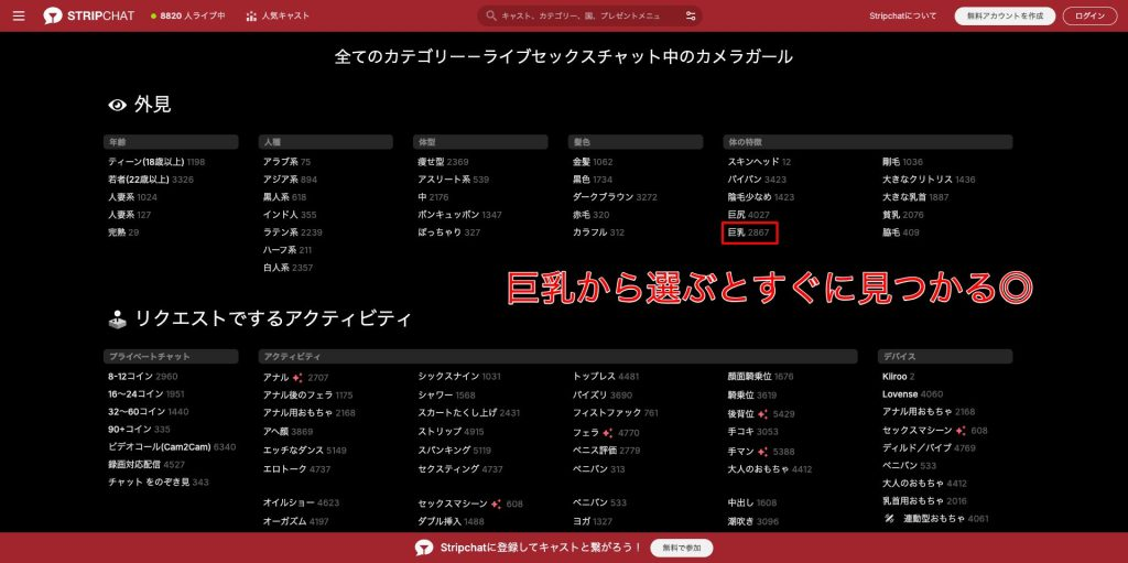 Stripchatは常時5,000人以上の配信者がライブ配信を行っている、世界最大級のアダルトライブチャットプラットフォーム。その中には魅力的な日本人配信者も多数在籍していて、無料でも十分に楽しめるコンテンツが揃っている。